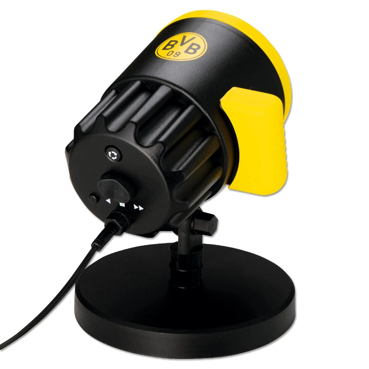 Man nehme: eine Technik, die begeistert. Dazu ein Zeichen, das euphorisiert. Und schon hat man einen neuen BVB-Fanartikel, der für Furore sorgt. Die Rede ist vom neuen BVB-LED-Logostrahler, mit dem Ihr unser geliebtes Vereinssymbol auf Häuser, Bäume, Zimmerwände oder andere Objekte projizieren könnt. Das Gerät ist wetterbeständig und drinnen wie draußen einsetzbar. Die BVB-Logos können in zwei Geschwindigkeitsstufen rotieren ? mit 60 oder 200 Sekunden pro Umdrehung. Und aufgestellt sind sie mit einem Erdspieß für draußen bzw. einem Indoorsockel für drinnen auch in Nullkommanix.
