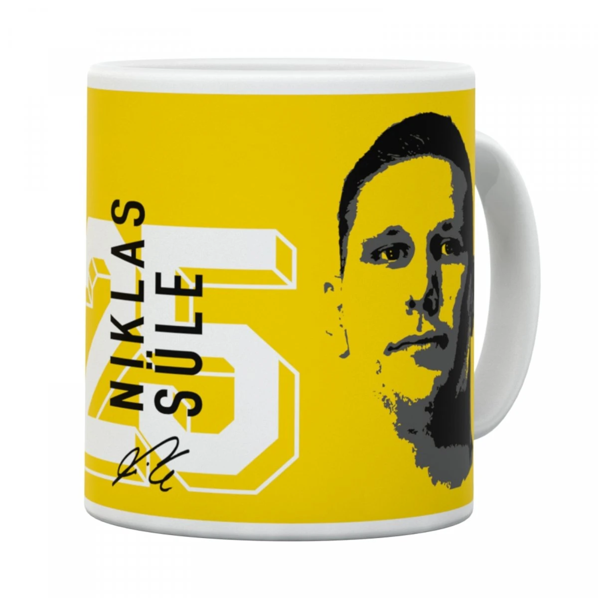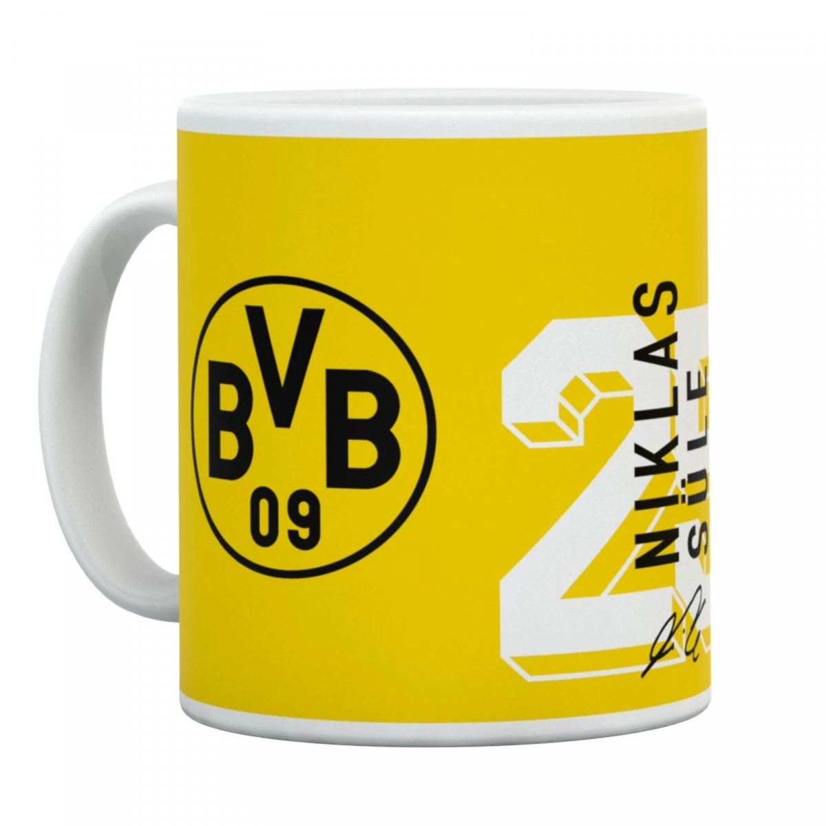 Die BVB Fan Tasse für unsere Nummer 25 – Niklas Süle. Einmal das Abwehrbollwerk am Frühstückstisch sein – mit der gelb-weißen Tasse mit dem Konterfei von Niklas, seiner Rückennummer 25, einer geduckten Signatur und natürlich dem Borussia Dortmund Logo ist das kein Problem. Die Tasse ist der Extra-Artikel für die Fans von Niklas.