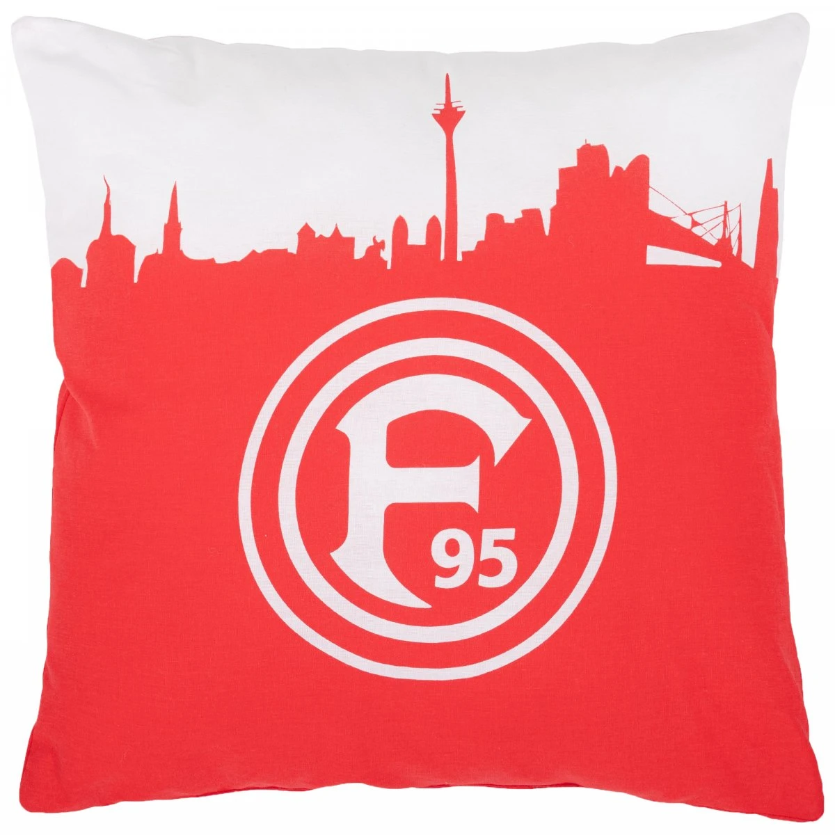 Das Kissen „Stockum“ mit rot-weißem Farbverlauf, einem weißen F95-Logo und der Silhouette der Düsseldorfer Skyline sieht nicht nur schön aus, sondern leuchtet dank seines „Glow-in-the-dark“-Effekts auch im Dunkeln.