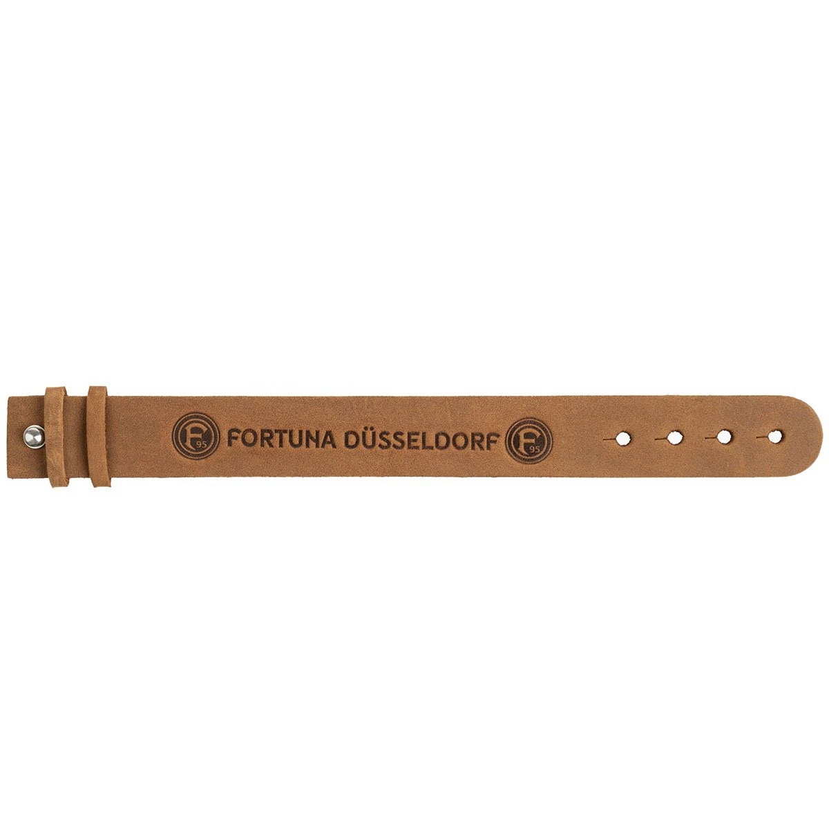 Das braune Fortuna-Lederarmband ist perfekt zu einem Abend in der Altstadt mit Freunden oder zum Besuch im Stadion. Auf dem Armband sind zwei F95-Logos und ein „Fortuna Düsseldorf“-Schriftzug eingeprägt
