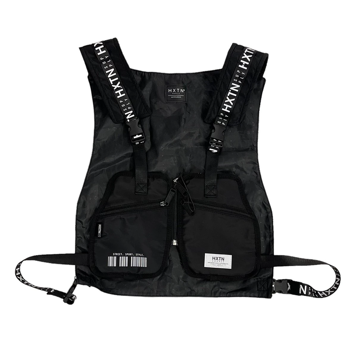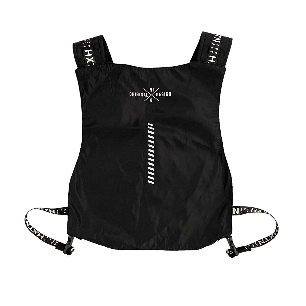 Key feature – Unique ‚jacket‘ style. HXTN branded adjustable straps. Centre zip for closed or open wear. Dual zip protected body pouches. Utility taping and hang clip. Mesh back panel with reflective taping for comfortable wear.