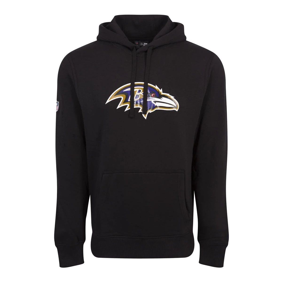 NFL Hoodie der Baltimore Ravens zum Überziehen mit gerippten seitlichen Einsätzen, Kängurutasche, einem flachen Kordelzug mit Ösen mit Markenzeichen, Teamlogo in pigmentierter Grafik und mit Druckfarbe auf Wasserbasis. Auf dem linken Armabschluss befindet sich die New-Era-Flagge, der rechte Arm ist mit einem NFL-Logo verziert.